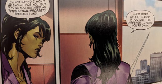 X-Men #23 & Invincible Iron Man #7: I’m enjoying Gerry Duggan’s run on IIM and how it’s intertwining with X-Men. This week, we see the debut of the Stark Sentinels in X-Men with Tony in “build-a-new-suit-of-armor-maybe-in-a-cave” mode over in his own book. Also, as an intellectual property lawyer by day, I appreciated these panels from a recent IIM issue, and remain on standby if Marvel ever wishes to incorporate more IP stories into its books.